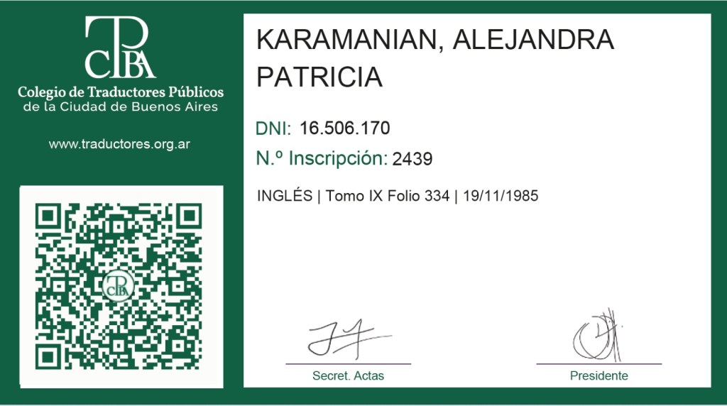 La matrícula certifica que el traductor/la traductora posee el título habilitante de traductor/a público/a, está inscripto/a en los registros correspondientes, asegura a la comunidad que cuenta con la formación y capacidad necesarias para realizar traducciones con responsabilidad y profesionalismo. Con su firma y sello, certifica que ha traducido de manera precisa según su leal saber y entender.